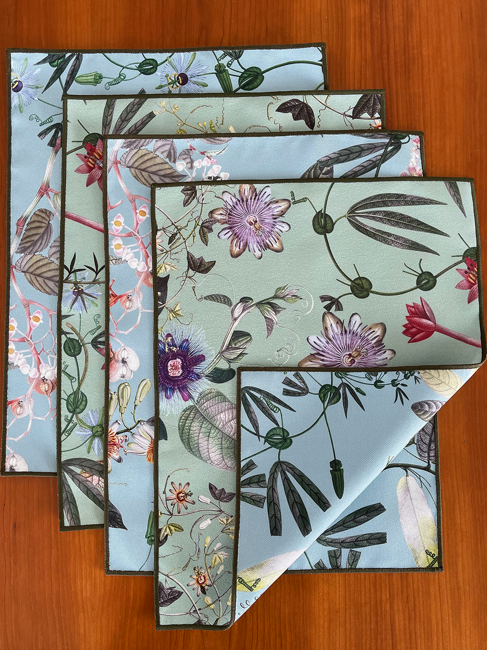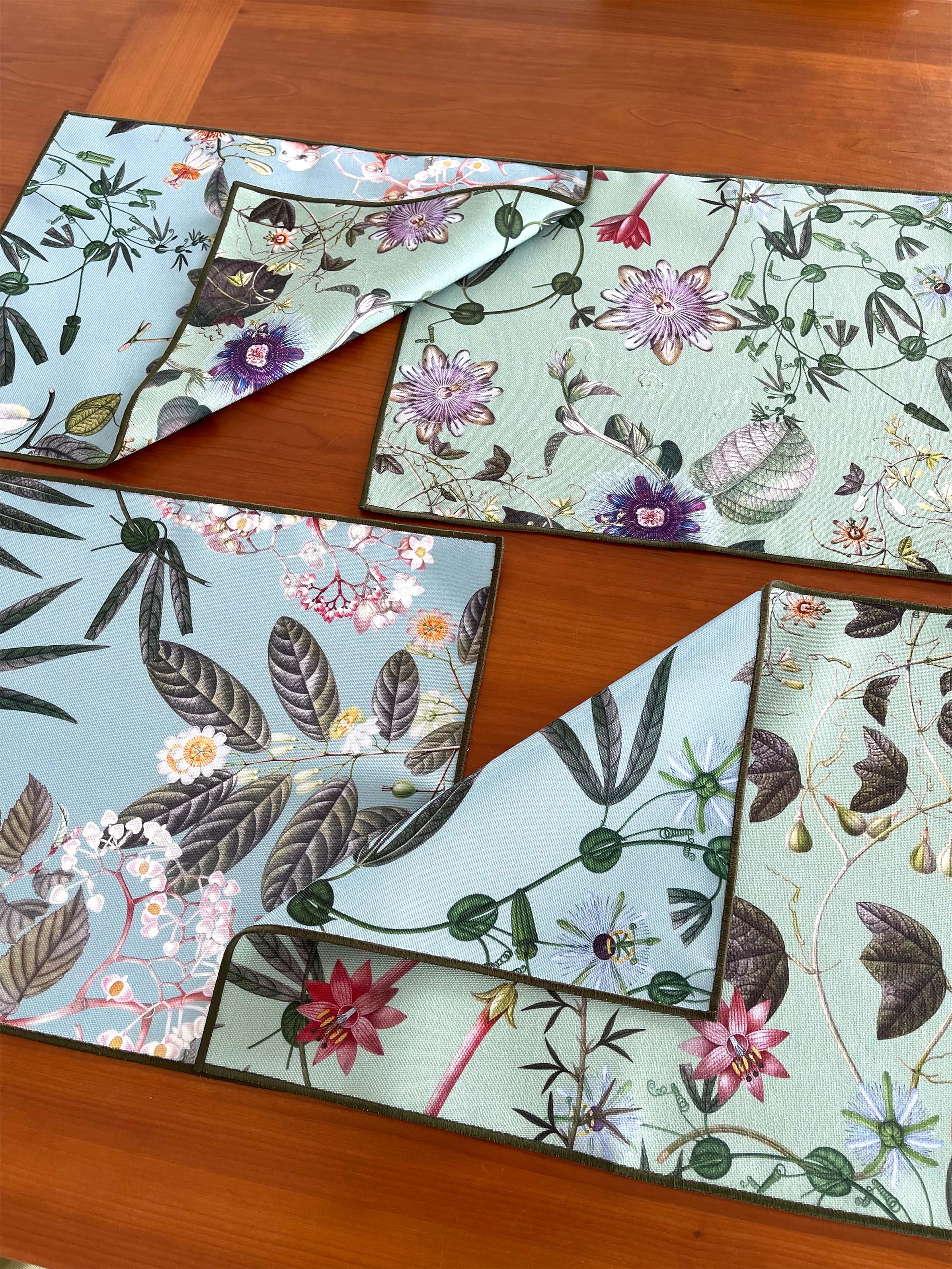 Individual doble para utilizar por ambas caras. Para combinar azules con verdes y jugar con tu mesa. Tela repele líquidos y es de fácil limpieza. Lavar a máquina, no usar secadora.