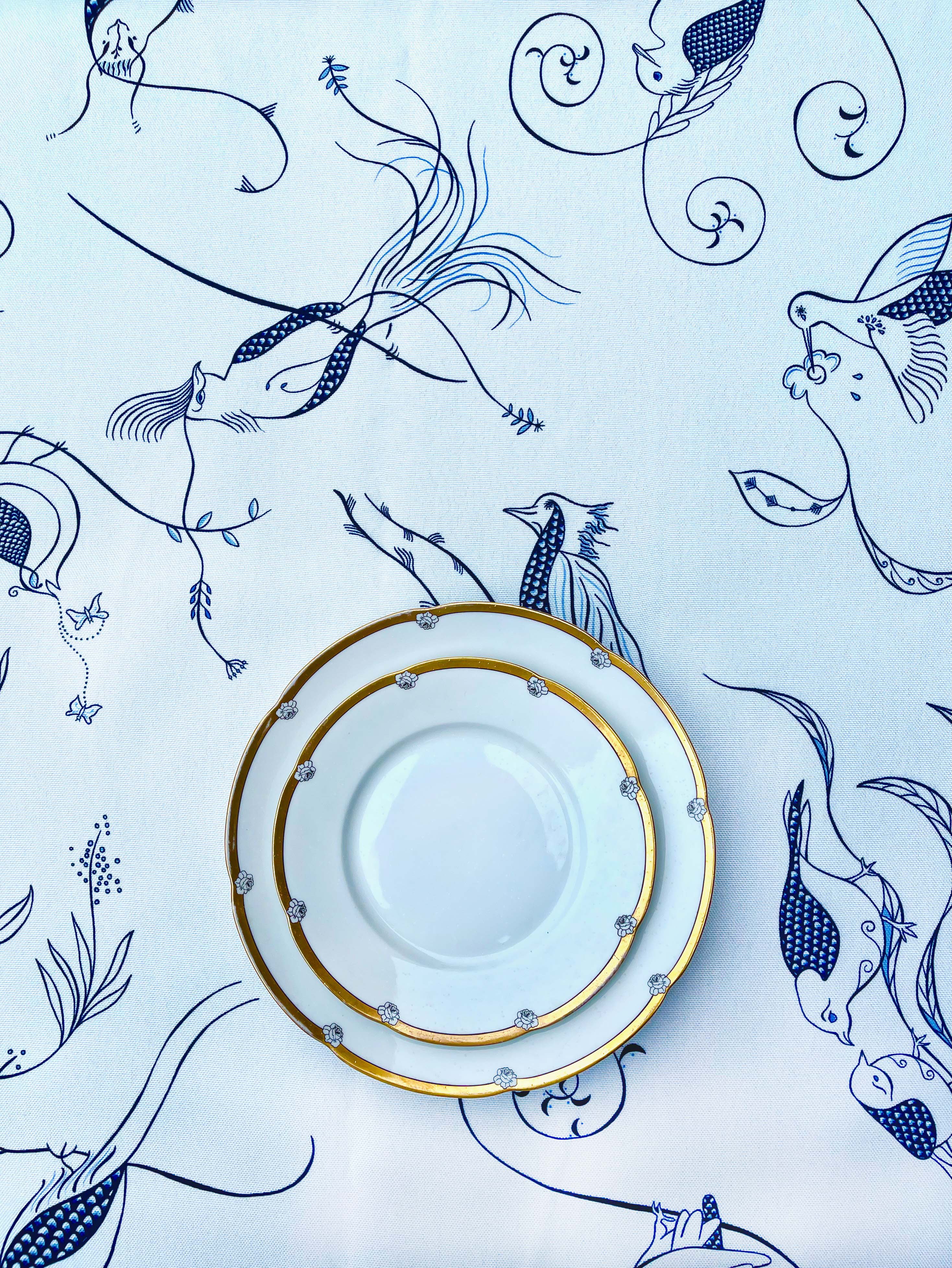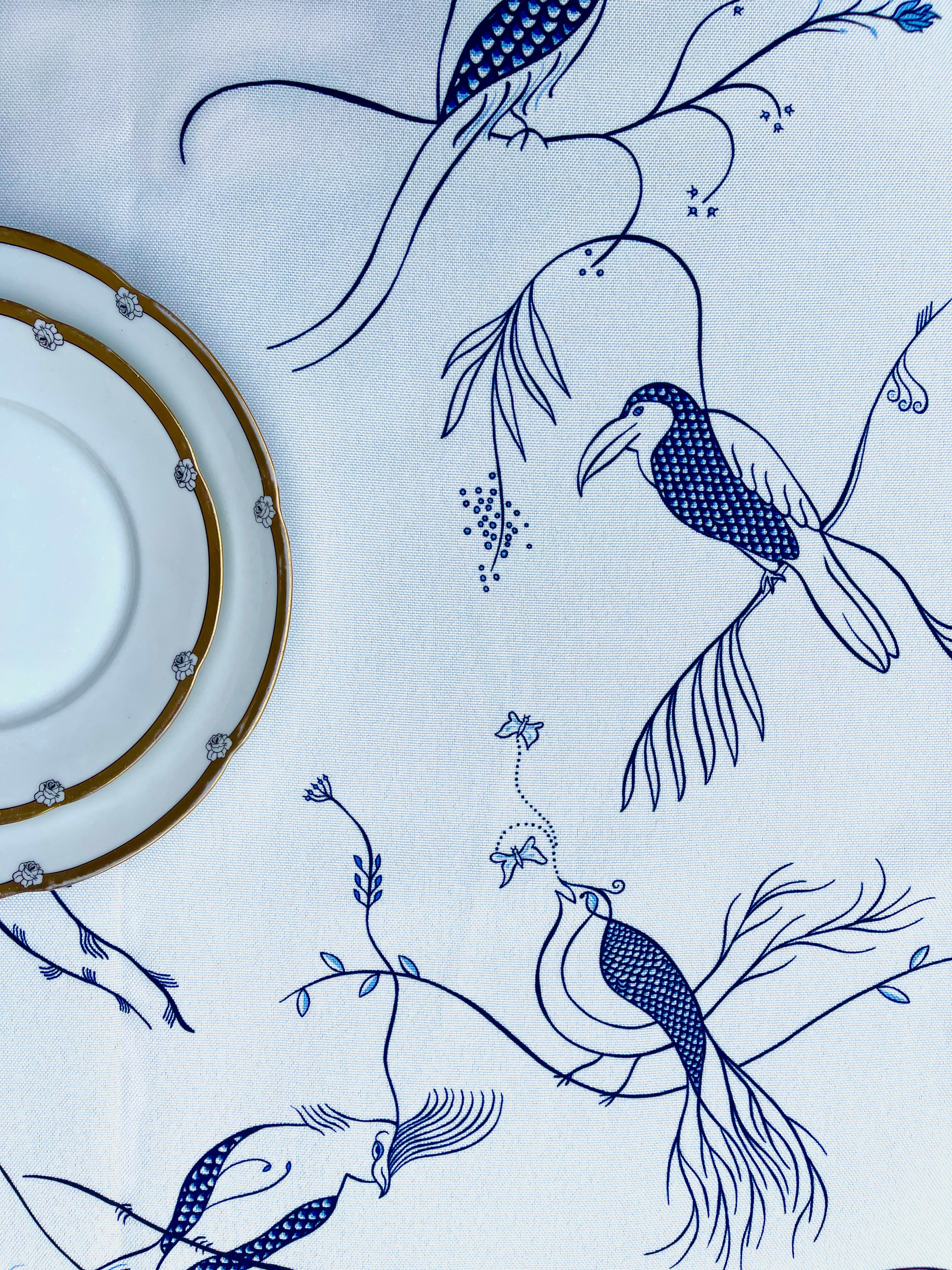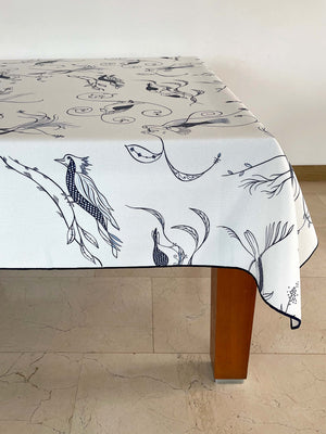 Mantel con aves dibujadas en finas líneas de caligrafía. Colombia es uno de los países con mayor cantidad de aves. Tela repele líquidos y es de fácil limpieza. Lavar a máquina, no usar secadora.