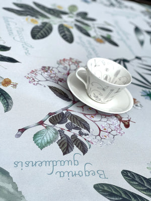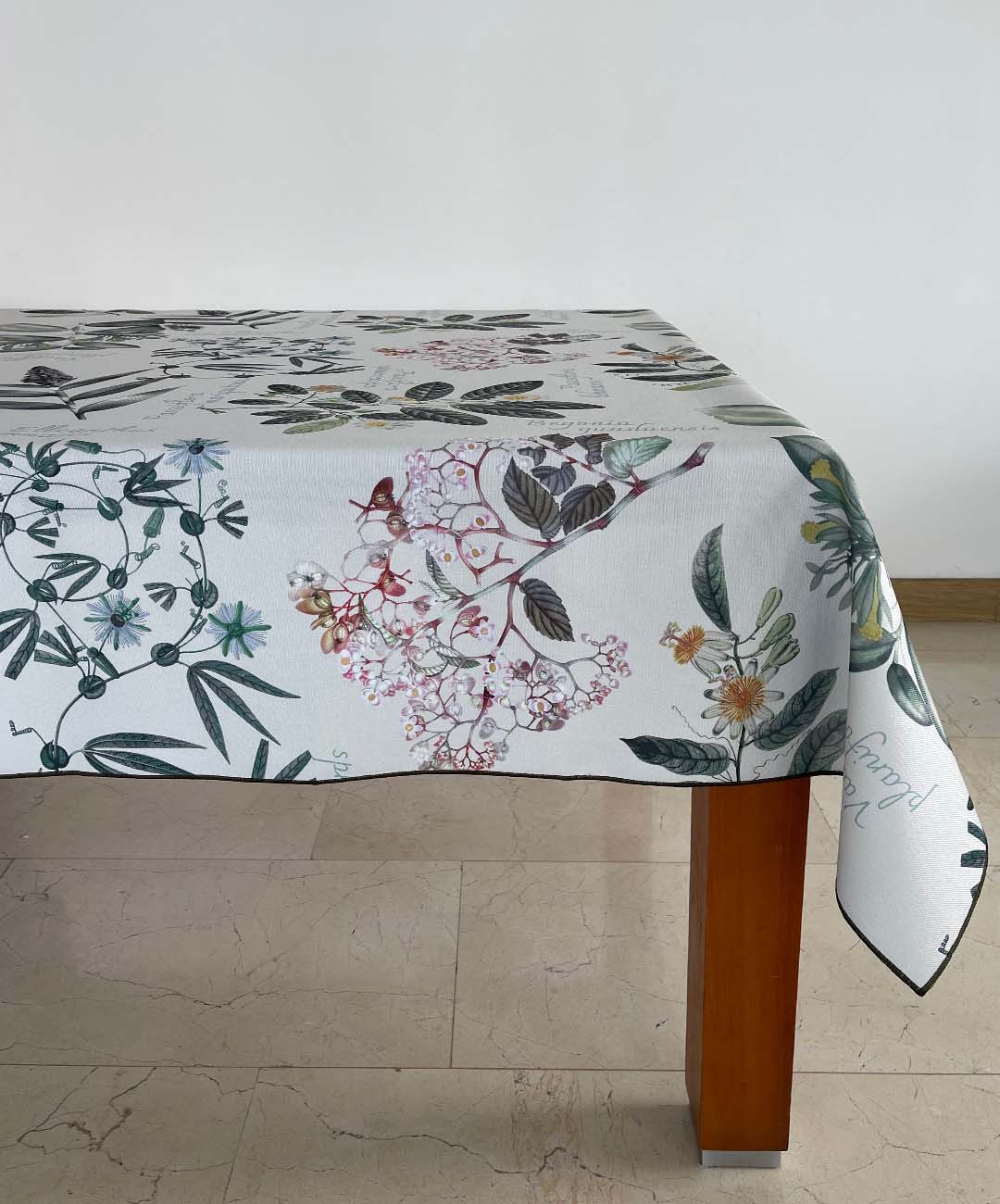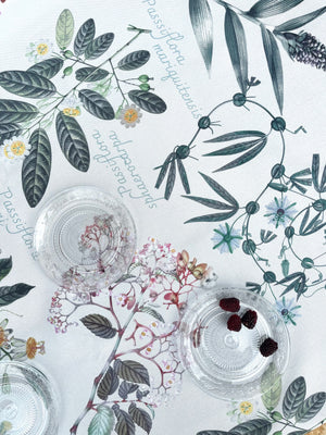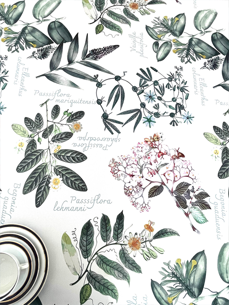 Mantel con dibujos de plantas como Orquídea Vainilla, Begonia, Elleanthus y Passifloras, marcan una tendencia del cuidado de la naturaleza. Tela repele líquidos y es de fácil limpieza. Lavar a máquina, no usar secadora.